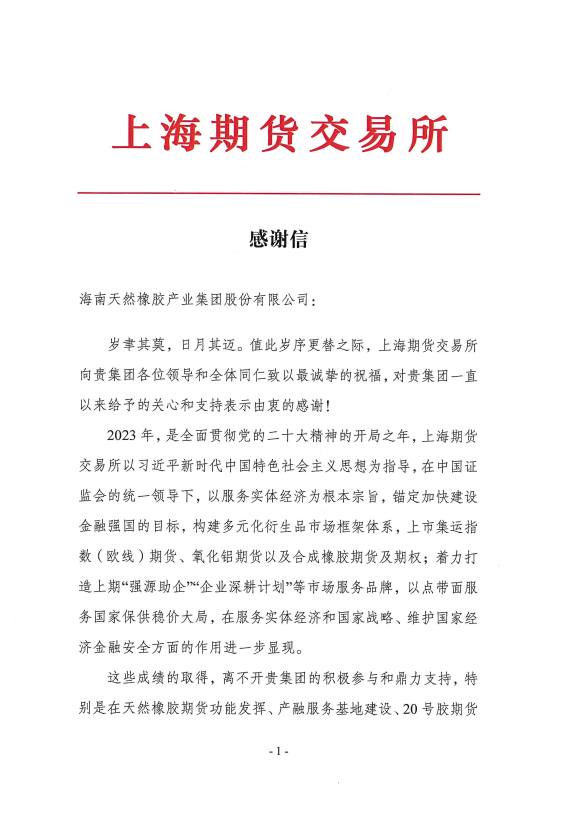 近日,海南橡膠收到一封來自上海期貨交易所的感謝信,信中對海南橡膠在天然橡膠期貨功能發揮、產融服務基地建設、20號膠期貨“豐羽行動”、能源化工產品委員會工作等方面給予的高度重視和支持表示感謝。