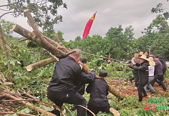9月10日清晨,在海南橡膠西聯分公司五星片區勝利隊,隊長吳清德與分公司搶險救災隊伍一起,與時間賽跑,把阻礙交通的倒伏樹、斷枝樹逐一清除。