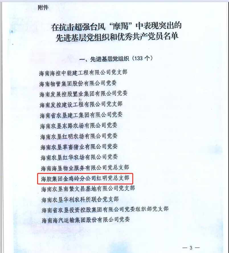 近日,中共海南省農(nóng)墾投資控股集團有限公司委員會下發(fā)《關于表彰在抗擊超強臺風”摩羯“中表現(xiàn)突出的先進基層黨組織和優(yōu)秀共產(chǎn)黨員的決定》。海南橡膠黨委、金雞嶺分公司紅明黨總支、西聯(lián)分公司新盈片區(qū)黨總支、紅光分公司紅旗片區(qū)黨總支第四支部等4個先進基層黨組織,海南橡膠黨委委員、副總經(jīng)理陳皞,人力資源部高雷,瑞橡公司翟翊先,紅華分